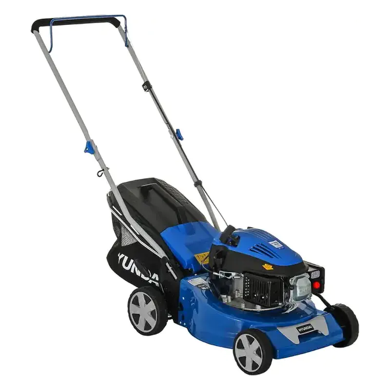 Бензиновая косилка Hyundai L 4220 весит около 19 кг и приводится в движение оператором. Задние колеса имеют увеличенный диаметр и оснащены шарикоподшипниками для плавного хода и маневренности. Ширина деки 41,7 см позволяет косить траву на участках сложной формы, проходить узкие места и огибать препятствия.