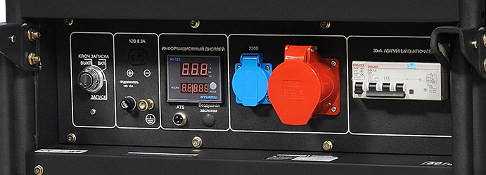 Двигатель генератора запускается как вручную, так и с помощью электростартера – как в автомобиле. При необходимости можно дополнительно установить блок ATS, тогда в случае проблем на основной электросети электростанция автоматически переведет питание на себя. Розетки, разъемы для подключения оборудования и все органы управления находятся на лицевой панели в удобном доступе.