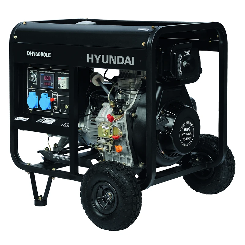 Hyundai DHY 6000LE оснащен двигателем серии IC (industrial commercial) объемом 418 см³ и мощностью 10 л.с. Инжекторная система прямого впрыска подает топливную смесь напрямую в камеру сгорания, что существенно сокращает расход дизеля и количество вредных выхлопов. Запустить мотор можно как вручную, так и с помощью электростартера.