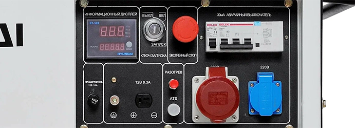 Дизельный генератор Hyundai можно запрограммировать на автоматическое включение при поломках на основной электросети. Для это нужен блок ATS (приобретается отдельно), который будет постоянно мониторить наличие напряжения в сети. При отсутствии электричества автоматика переведет питание на генератор, а при возобновлении подачи, заглушит двигатель.