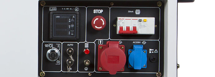 На панели управления генератора Hyundai DHY 8500SE размещены две розетки 230 В: бытовая 16 и силовая 32 А. Каждая имеет защитный колпачок, который предотвращает попадание пыли и грязи внутрь. Электростанция будет стабильно работать при температуре от -25 до + 30 °C.