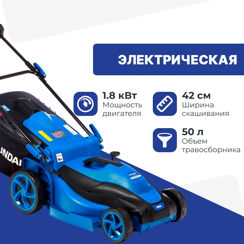 Электрическая газонокосилка Hyundai помогает в уходе за газонами — чисто срезает траву на заданную высоту и собирает в травосборник. Полученную биомассу можно использовать для мульчирования грядок или заготовки компоста. Благодаря ширине скашивания 42 см и особой конструкции деки газонокосилка аккуратно подравняет газон в узких проходах, вплотную к стенам, бордюрам и заборам.