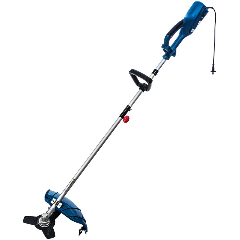 Кнопка-предохранитель защищает инструмент от случайного включения. Двигатель мощностью 1 кВт с плавным пуском постепенно набирает обороты без стартовых рывков. Рабочая насадка в виде полуавтоматической катушки с леской диаметром 2 мм обеспечивает качественный регулярный уход за участком. Трехлопастной стальной нож эффективен при расчистке территории от зарослей сорняков и поросли диких кустарников со стеблями толщиной менее 2 см. Благодаря небольшой ширине обработки — леской 380 мм и ножом 255 мм — вы скосите электротриммером Hyundai GC 1000 траву в труднодоступных местах.